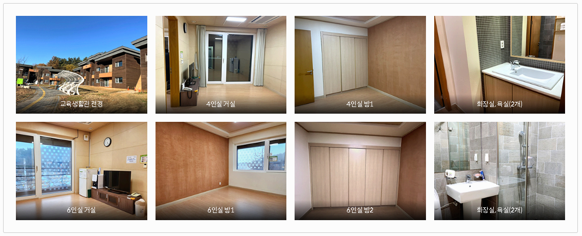 | 1동~4동 6인실 | 69.76㎡ | 6인 | 10만원 | 거실+방2+화장실2+욕실2 | 13개 |
